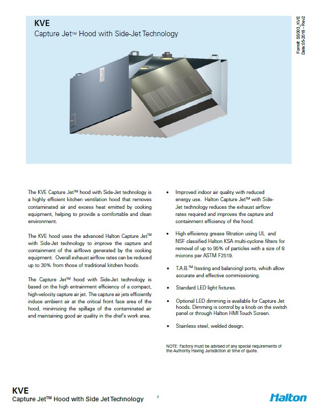 O exaustor comercial KVE utiliza o avançado Halton Capture JetTM com tecnologia Side-Jet para melhorar a captura e contenção dos fluxos de ar gerados pelo equipamento de cozinha. As taxas gerais de fluxo de ar de exaustão podem ser reduzidas em até 30% em relação aos exaustores de cozinha tradicionais.